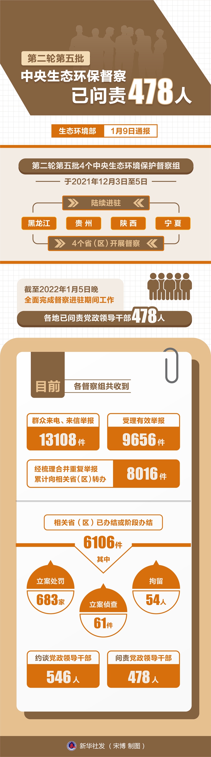 新华社北京1月9日电(记者高敬)生态环境部9日通报,第二轮第五批4个中央生态环境保护督察组于2021年12月3日至5日陆续进驻黑龙江、贵州、陕西、宁夏4个省(区)开展督察。截至2022年1月5日晚,全面完成督察进驻期间工作。各地已问责党政领导干部478人。