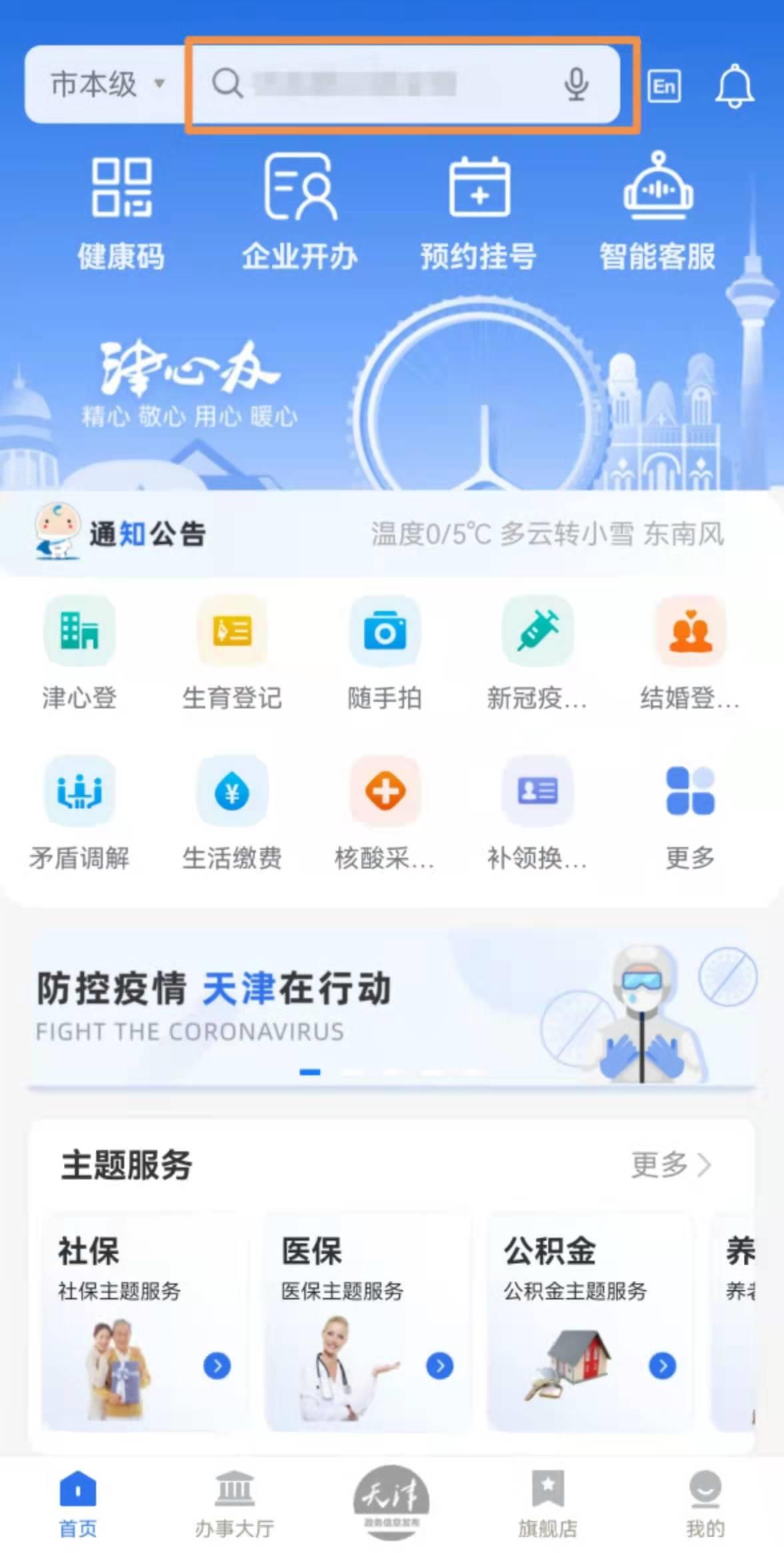 下载并打开“健康天津”App,在首页上方搜索栏中输入“核酸”,点击“核酸查询”。