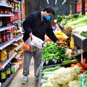 1月7日,西安曲江新区一小区超市内,一名居民在选购菜品。新华社记者 邵瑞 摄