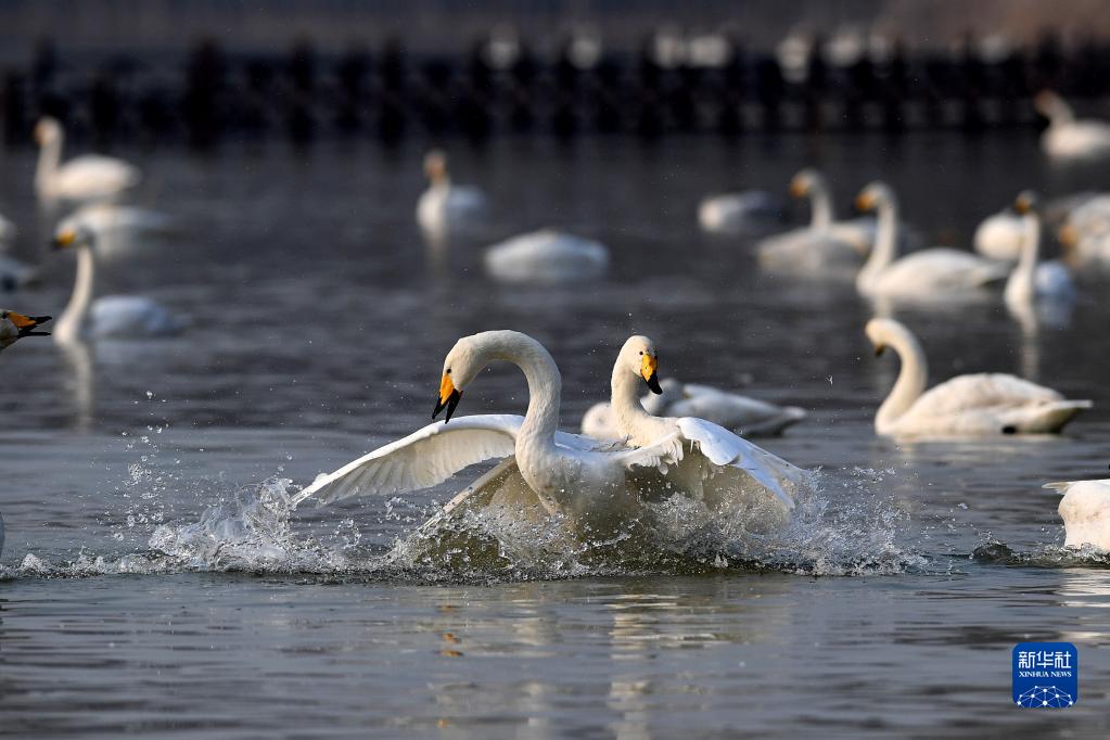 冬日暖阳下,山西芮城县圣天湖湿地、平陆县三湾湿地的湖面上,数以万计的野生大天鹅随波嬉戏,欢叫声此起彼伏。