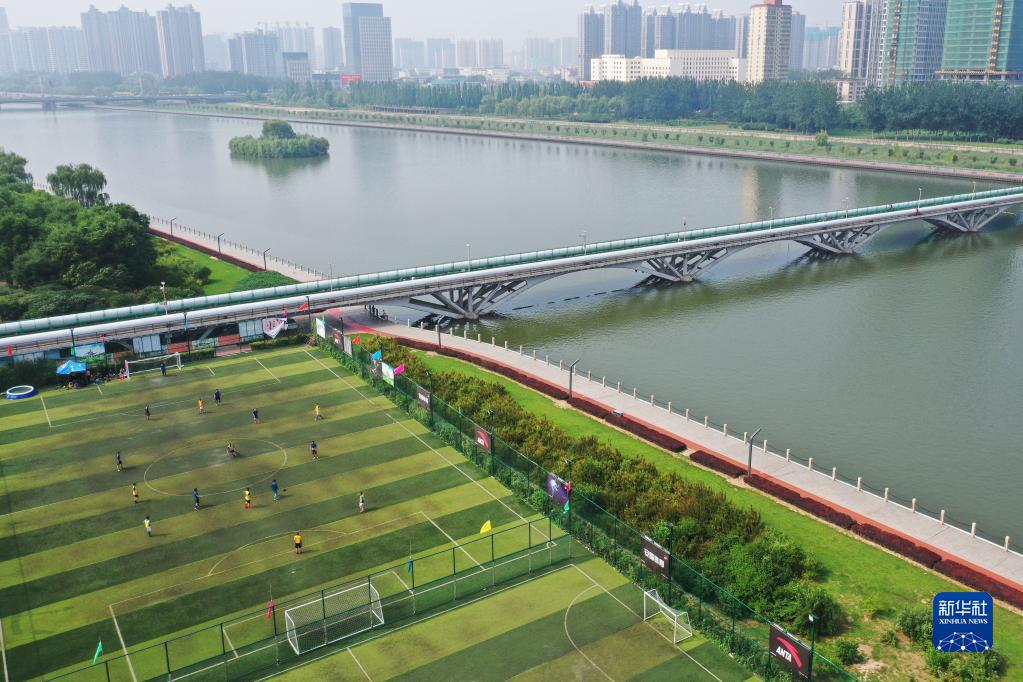 市民在太原市汾河畔的公园内踢足球(无人机照片,2019年7月28日摄)。新华社记者 杨晨光 摄