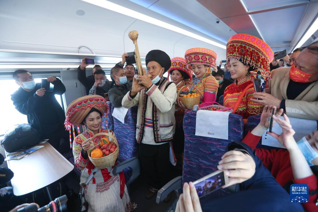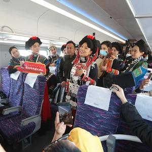 1月10日,在D843次复兴号动车组列车上,德昌县傈僳族群众身着盛装表演节目。新华社记者 江宏景 摄
