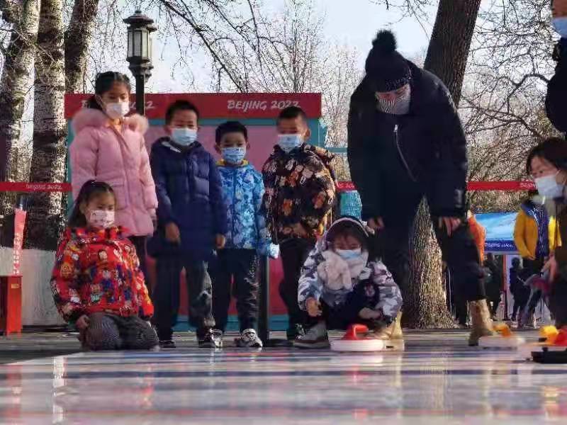 1月8日,北京市东城区地坛八区文化广场,市民参与冬奥文化体验运动。(受访者提供)