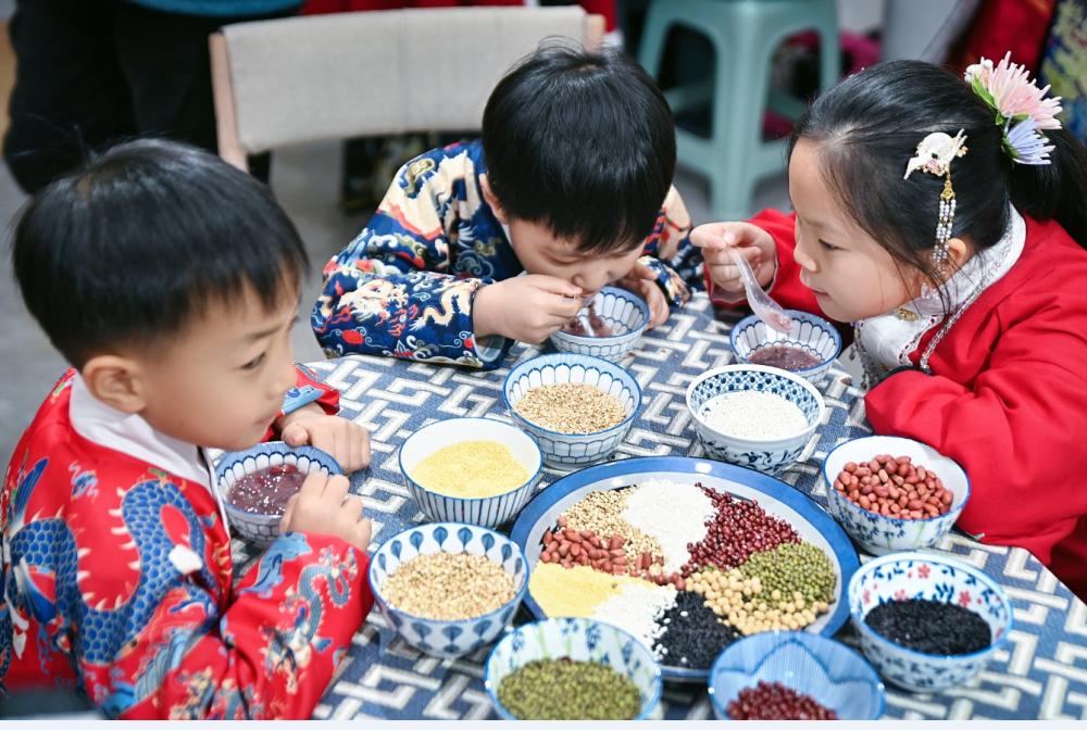 在河北省唐山市丰南区河头幼儿园,小朋友学习辨识腊八粥食材。 腊八来临,一些幼儿园举行相关主题活动。孩子们在老师的指导下,学习辨识制作腊八粥的食材,感受传统民俗文化。 新华社发(李秀清摄)