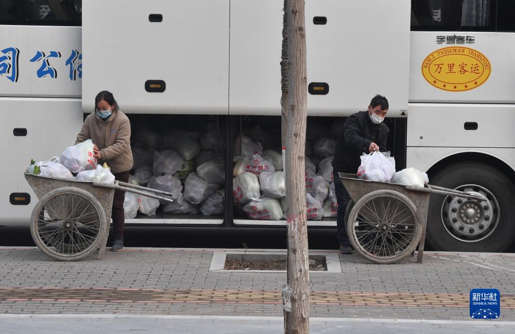 1月10日,在禹州市寨子社区,工作人员将蔬菜包卸车。