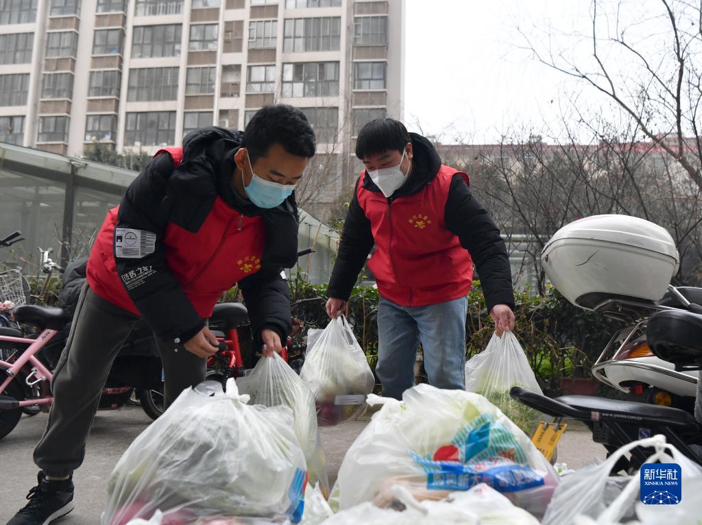 1月10日,在禹州市永和苑社区,志愿者在搬运蔬菜包。