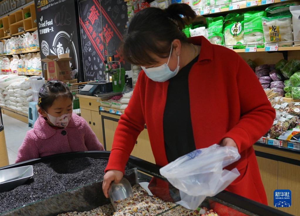 1月10日,在青海省海北藏族自治州门源回族自治县一家超市,市民李林梅在挑选制作腊八粥的食材。新华社记者 李宁 摄