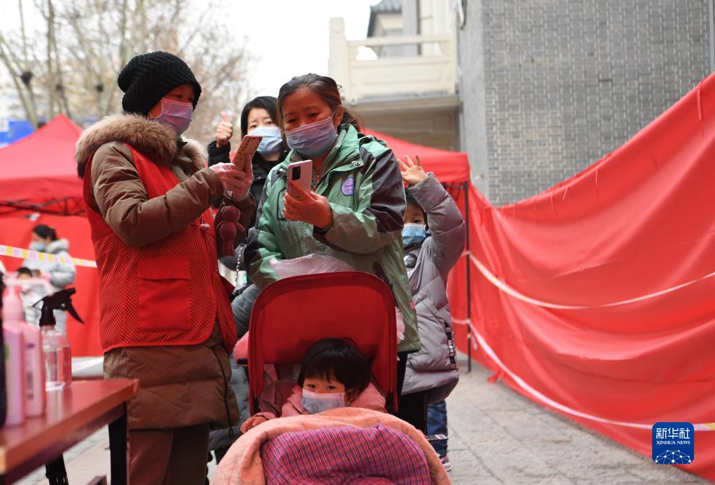 1月8日,在郑州市金水区花园路街道一核酸检测点,志愿者协助市民进行扫码登记。