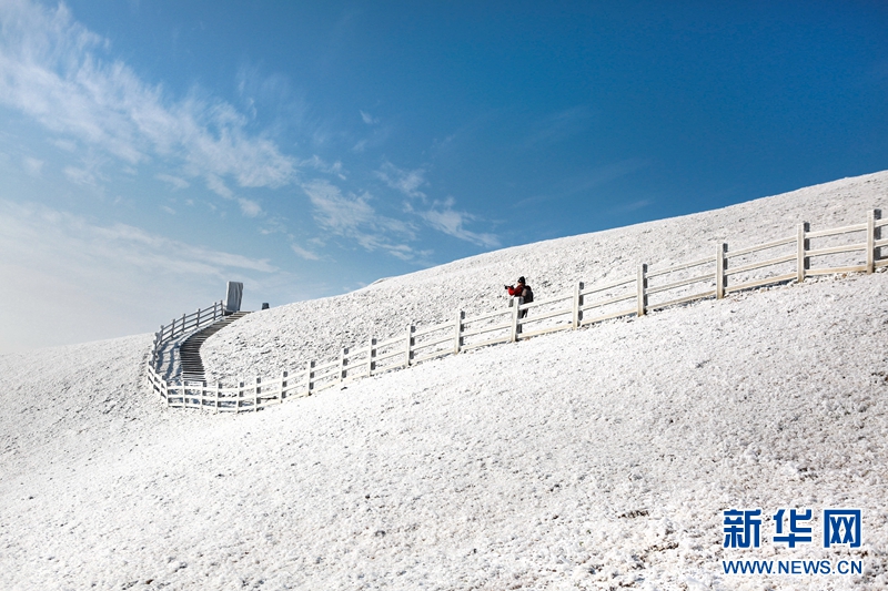 近日,寒潮来临,在浙江省安吉县山川乡的云上草原,银装素裹,美轮美奂。雾凇和雪相互交融,谱写出一曲冰雪“圆舞曲”。