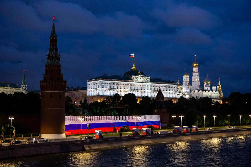 2020年6月12日,俄罗斯首都莫斯科的克里姆林宫红墙投射成俄罗斯国旗的颜色。(新华社发,亚历山大摄)
