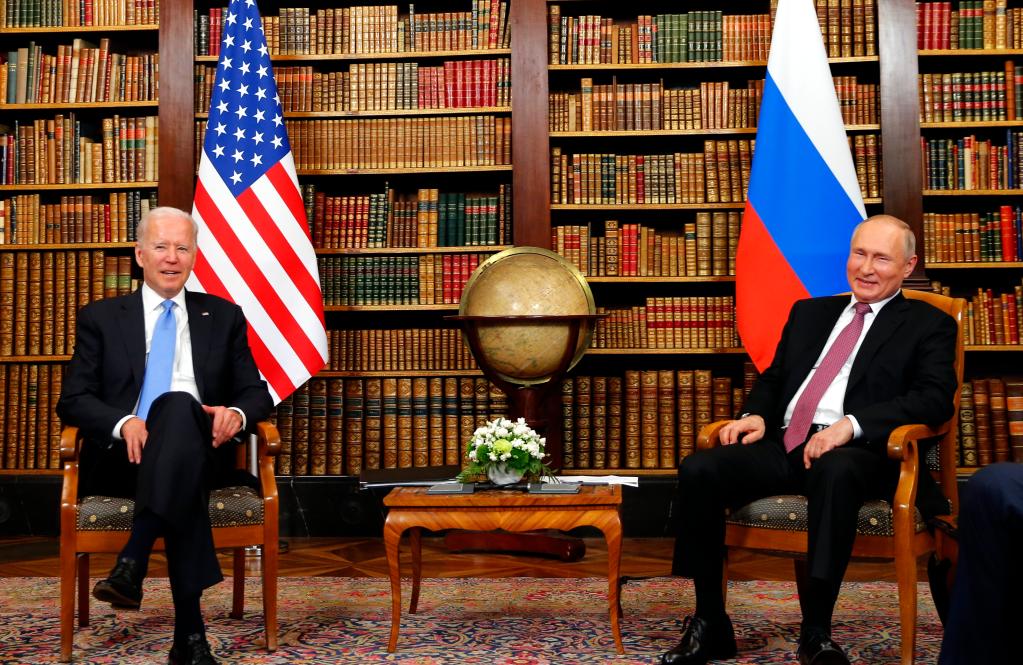 2021年6月16日,美国总统拜登(左)和俄罗斯总统普京在瑞士日内瓦的拉格朗热别墅举行会晤。(新华社发,Pool图片,丹尼斯·巴利布斯摄)
