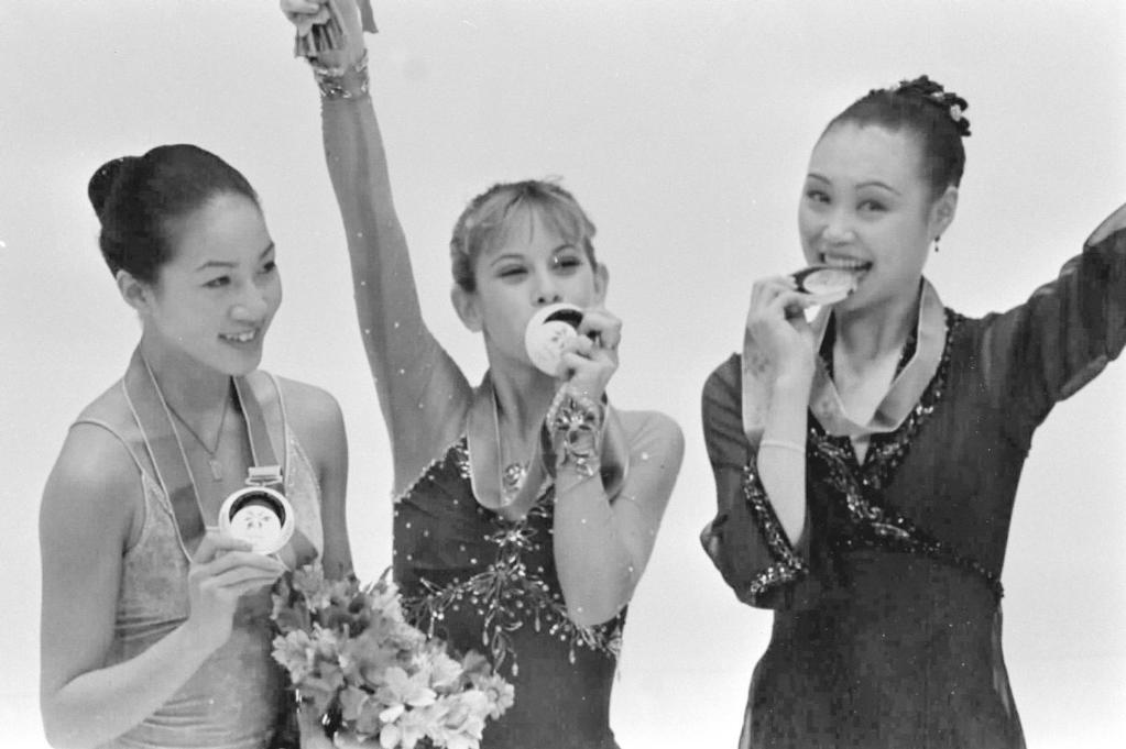 1998年2月20日,长野冬奥会花样滑冰女子单人滑三甲揭晓,美国选手利平斯基、关颖珊分获冠亚军,中国选手陈露(右)摘取铜牌。新华社记者陈建力摄(传真照片)