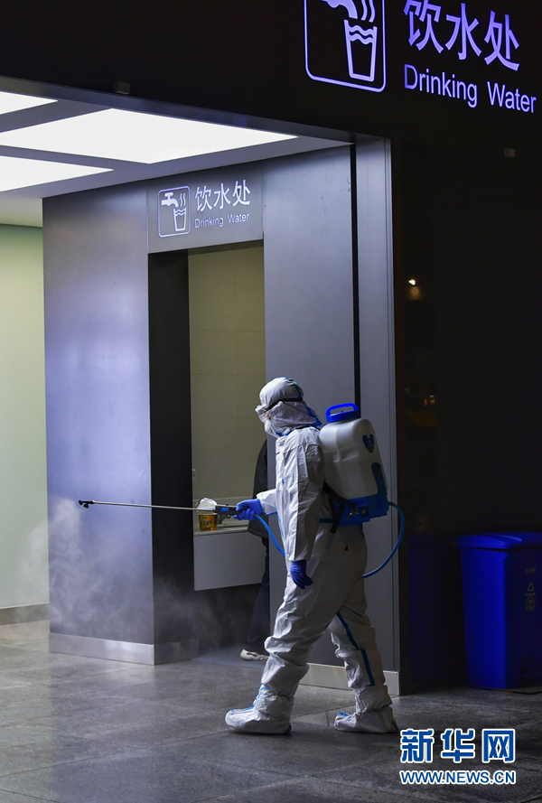 1月11日,天津铁路疾病预防控制中心工作人员在天津西站对旅客公共卫生饮水间进行消杀作业。新华网发(杨宝森 摄)