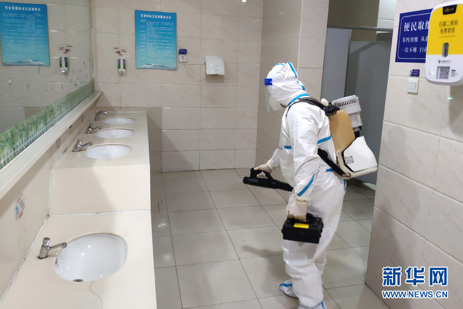 1月11日,天津铁路疾病预防控制中心工作人员在天津南站对旅客公共卫生间进行消杀作业。新华网发(杨宝森 摄)
