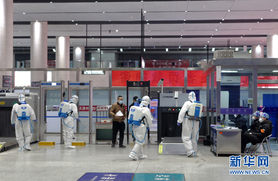 1月11日,天津铁路疾病预防控制中心工作人员在天津西站对进站安检仪进行消杀作业。新华网发(杨宝森 摄)