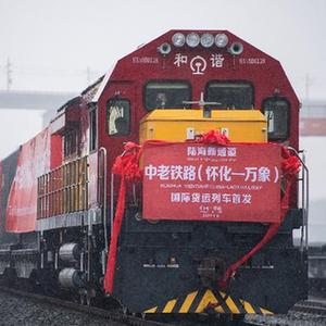 1月6日,开往老挝万象的中老铁路(怀化—万象)国际货运列车在湖南怀化国际陆港准备发车。(新华社记者陈思汗摄)