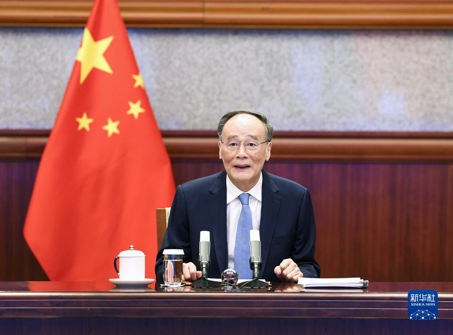 1月13日,国家副主席王岐山在北京钓鱼台国宾馆视频会见法国总统外事顾问博纳。新华社记者 庞兴雷 摄