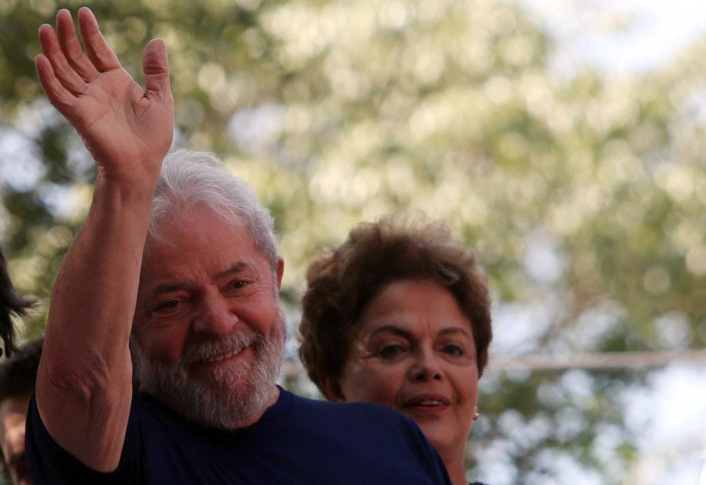 2018年4月7日,在巴西圣贝尔纳多-杜坎普的巴西钢铁工人工会总部前,巴西前总统卢拉(左)在另一位前总统罗塞夫(右)的陪同下向支持者挥手致意。(新华社发,拉赫尔·帕特拉索摄)
