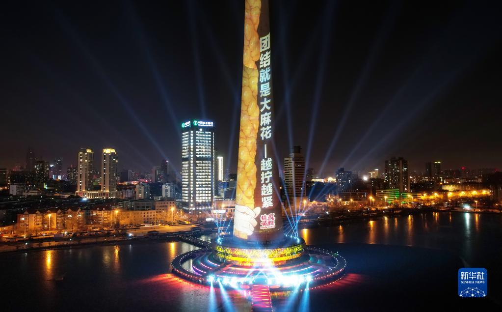 1月13日晚,天津市地标性建筑天塔上演以抗疫为主题的灯光秀,向并肩战“疫”的人们致敬(无人机照片)。