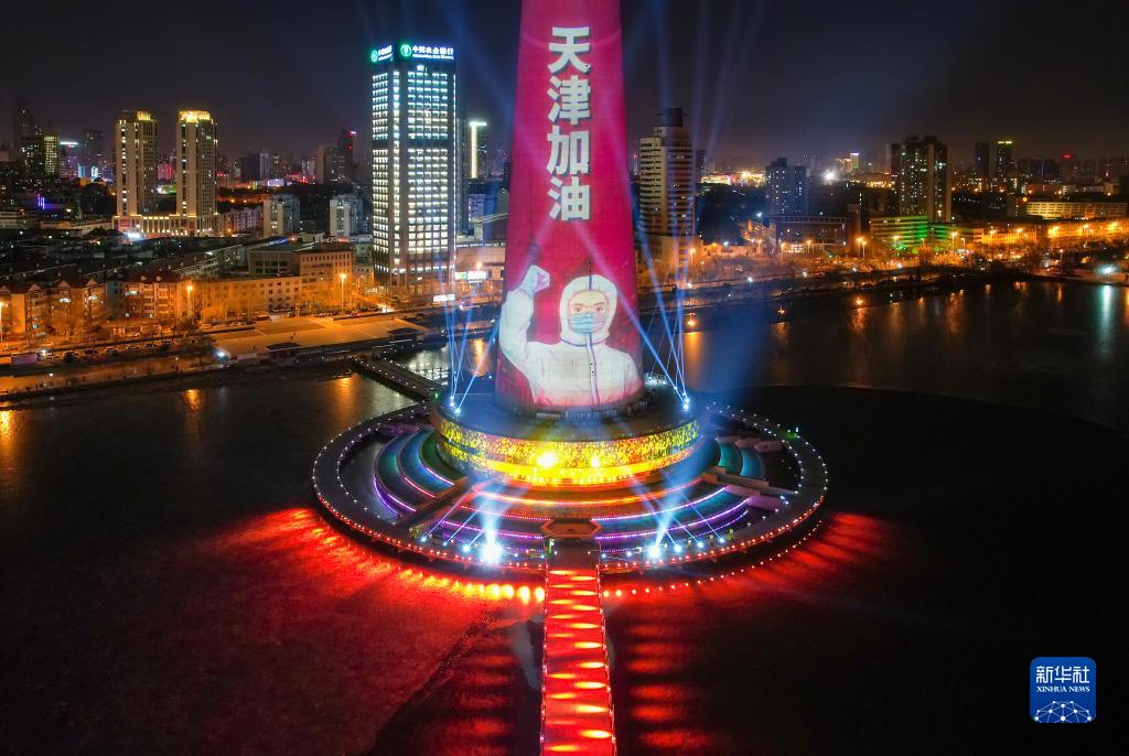 1月13日晚,天津市地标性建筑天塔上演以抗疫为主题的灯光秀,向并肩战“疫”的人们致敬(无人机照片)。