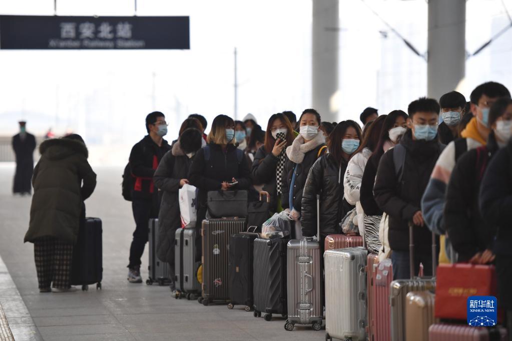 1月14日,乘坐专列返回西安的学生在西安北站排队出站。