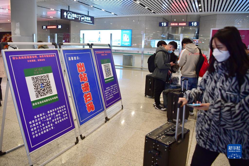1月14日,乘坐专列返回西安的学生在西安北站扫码出站。