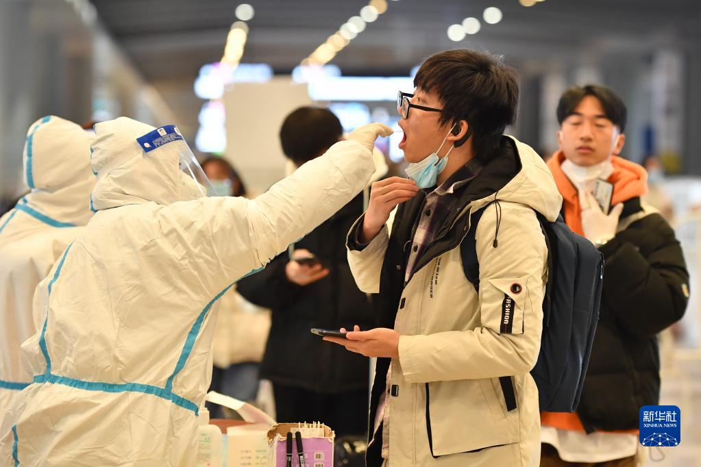 1月14日,乘坐专列返回西安的学生在西安北站出站口核酸检测点接受检测。