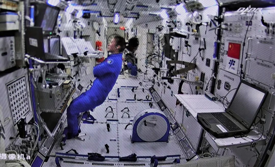 王亚平在天和核心舱内“飞翔”。新华社发(中国航天员中心提供)