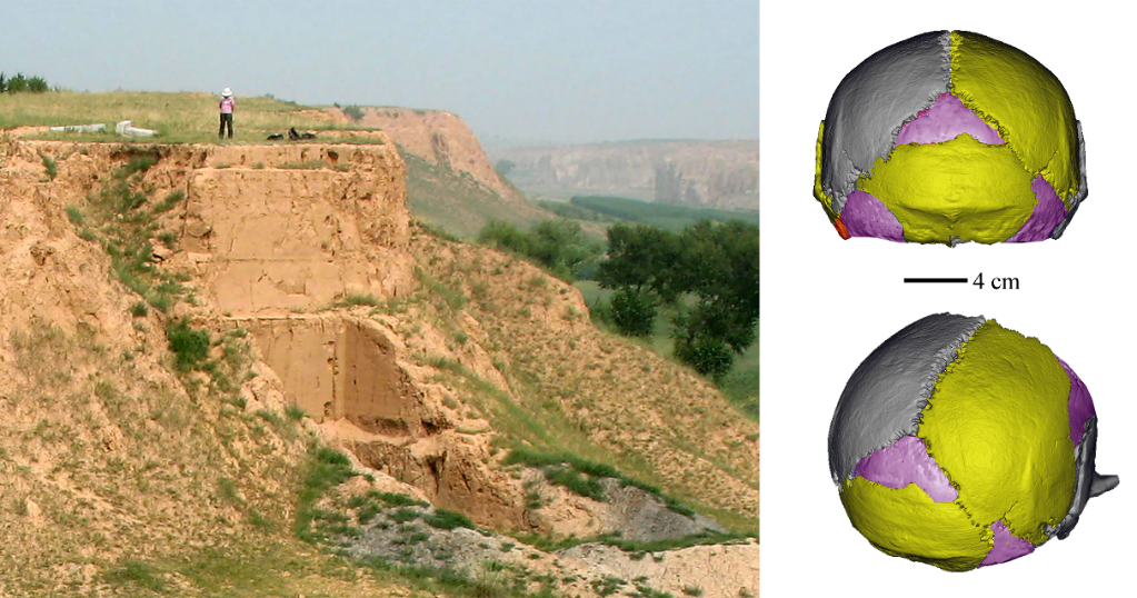 许家窑人遗址(左)及其发现的古人类化石复原头骨(右)。(中科院古脊椎所供图)