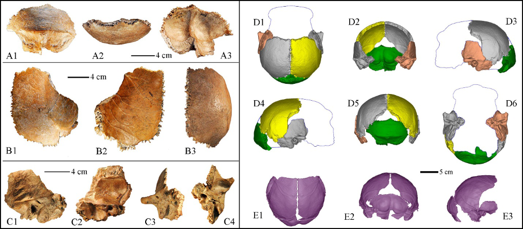 许家窑人头骨化石碎片及其复原的头骨和颅内模。(中科院古脊椎所供图)