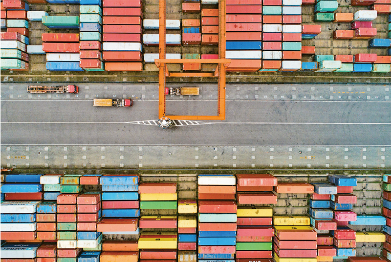 四川宜宾港依托物联网、5G 通信、可视化、智能化等先进信息技术,将传统码头升级改造成为智慧码头,全面提升港口智慧化、信息化作业水平。图为集装箱卡车在宜宾港集装箱码头往来穿梭,有序作业。 求是图片 庄歌尔/摄