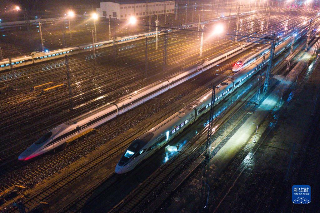 “打温”是铁路系统的专业术语。结束一天线路运行的动车组,在经过全面检查维护后,统一停放在室外存车场,为第二天的运输任务待命。为防止夜间动车组内部的复杂管路被冻坏,需要有“打温人”为停放的动车组供电,开启动车组加热系统,保障动车组各设备部件时刻处于良好状态。夜幕降临,贵阳车辆段贵阳北动车运用所的地勤机械师们穿梭在一辆辆动车组间,为2022年春运的第一批动车组“驱寒保暖”,保障春运安全。2022年春运将于1月17日开启。