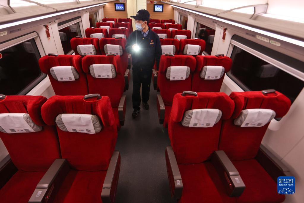1月16日,地勤机械师洪昊阳在动车组车厢内巡查。