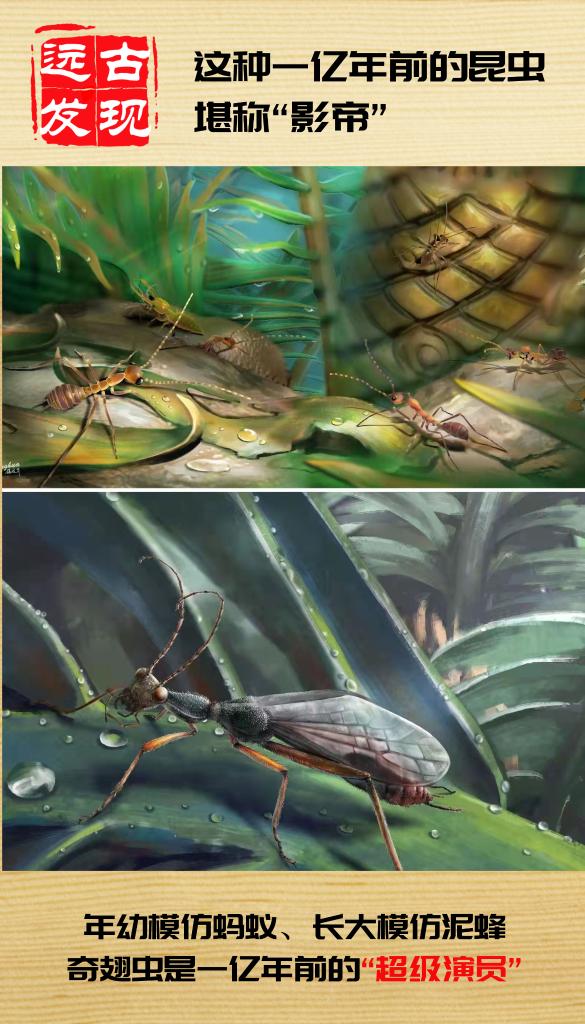 “生物在形态和行为上模仿另一种生物的现象被称为拟态,这在大自然中并不少见。但在生长过程中会转换模仿对象的动物,此前在化石中还从没发现过。小时候假装蚂蚁、长大后假装泥蜂,奇翅虫这种‘超级演员’一生都在模仿更为凶猛的昆虫。这种绝佳的‘演技’可能吓住天敌,让它们最大限度地保护自己。”王博说。