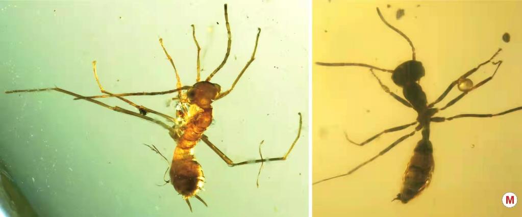左图为缅甸琥珀中的奇翅幼虫标本,右图为原始蚂蚁标本。(中科院南古所供图)