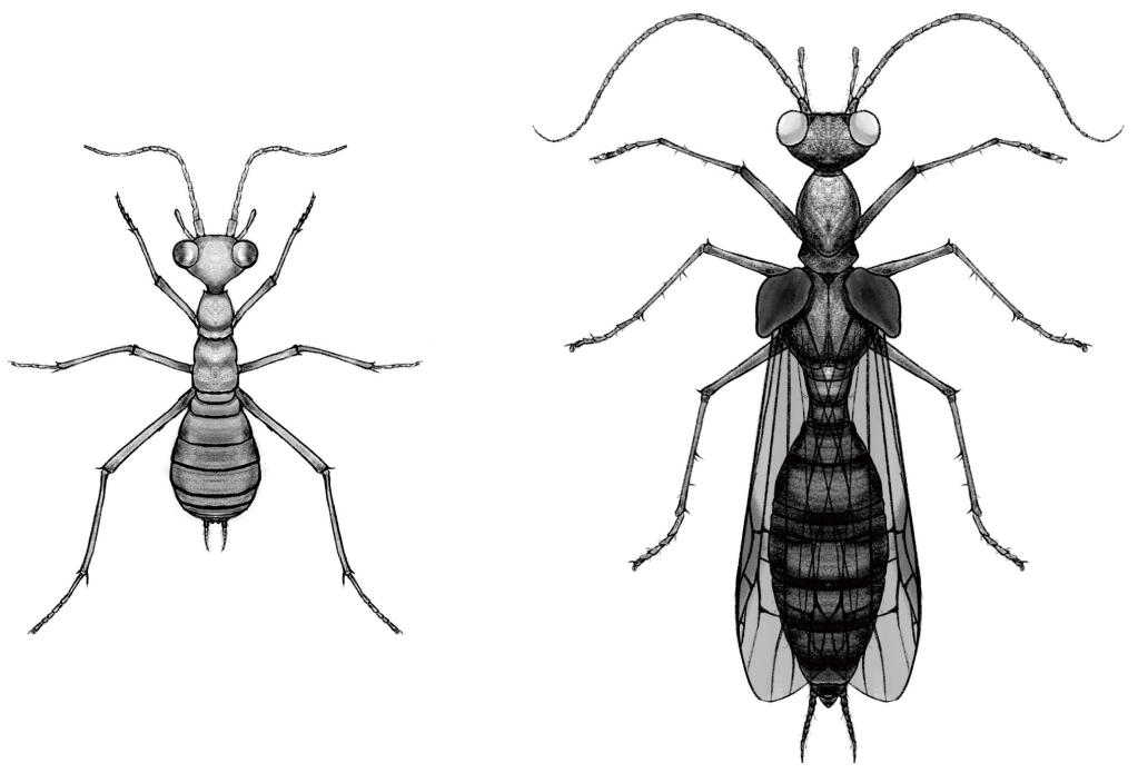 有趣的是,奇翅虫长大后,还变换了模仿对象。“奇翅成虫长出翅膀后,没法再‘扮演’没翅膀的蚂蚁了,又假装起了蜂类。”领导此项研究的中科院南古所研究员王博说,奇翅成虫的胸腹部变得很像蜂类的“细腰”,它们翅膀以及身体的形状和大小,也非常接近当时的一种原始蜂类:长背泥蜂。