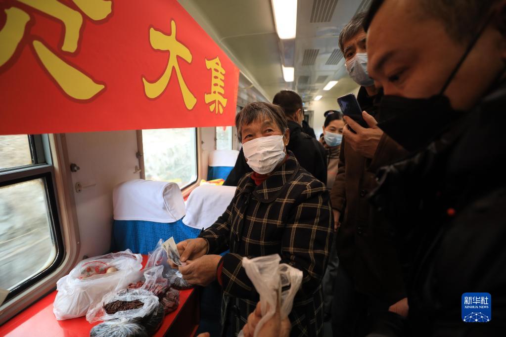 吉林通化至辽宁丹东的4318/7次列车是一辆行驶在东北东部山区的慢火车。为助力乡村振兴,中国铁路沈阳局集团有限公司吉林客运段在列车上开办“年货大集”。沿线各村镇的农民不用等到进城,就可在车厢里售卖自家山货。