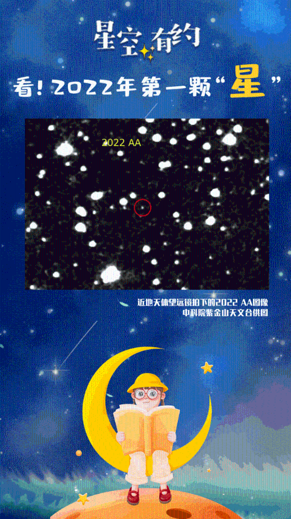 根据国际小行星中心的编号规则,“2022”代表小行星发现年份,其后的第一个字母“A”代表发现时间为1月上半月,第二个“A”说明其为这一时段内第一颗被发现的小行星。因此,“2022 AA”这一编号说明,这是2022年人类发现的第一颗近地小行星。