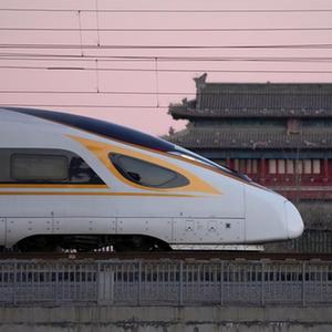 1月17日清晨,一列动车组列车驶过北京永定门城楼。新华社记者 邢广利 摄
