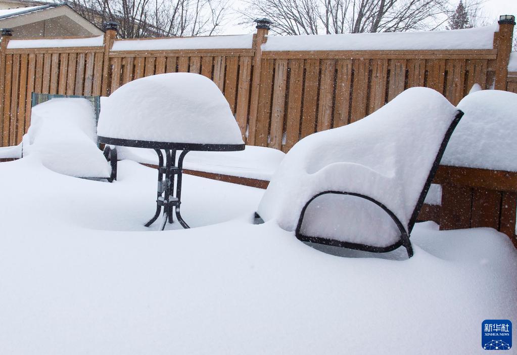 这是1月17日在加拿大大多伦多地区米西索加拍摄的一户人家院中积雪的桌椅。