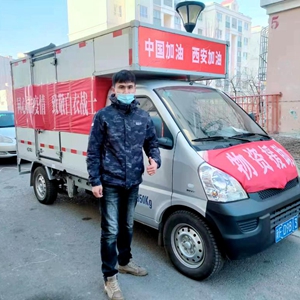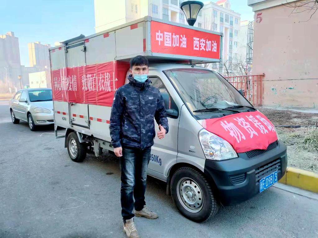 白色的货车上贴着印有“中国加油 西安加油”“同心抗击疫情 致敬白衣战士”的红色条幅,驰骋在高速公路上。