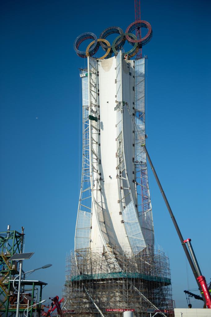 近日,位于北京冬奥会延庆赛区的“海陀塔”上的奥运五环结构吊装作业完成,塔顶设置奥运五环标志,表面安装7万余个白色点光源,塔身加装飘带形装饰,届时将在夜间点亮灯光景观,成为北京冬奥会标志性景观之一。新华社记者陈钟昊摄