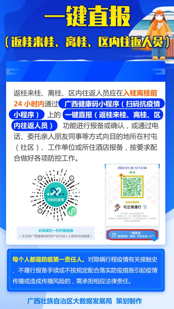 新华社南宁1月20日电(记者黄凯莹、梁舜)记者从广西壮族自治区大数据发展局获悉,为支持春节期间返桂来桂、离桂、区内往返人员信息登记报备工作,广西健康码20日上线一键直报小程序。