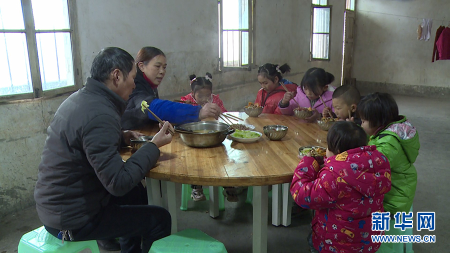 图为王朴夫妻与孩子们一同吃午饭。新华网发(吴建华 摄)