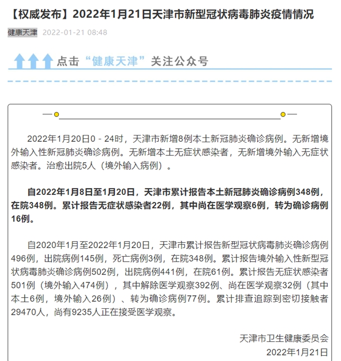 自2022年1月8日至1月20日,天津市累计报告本土新冠肺炎确诊病例348例,在院348例。累计报告无症状感染者22例,其中尚在医学观察6例,转为确诊病例16例。