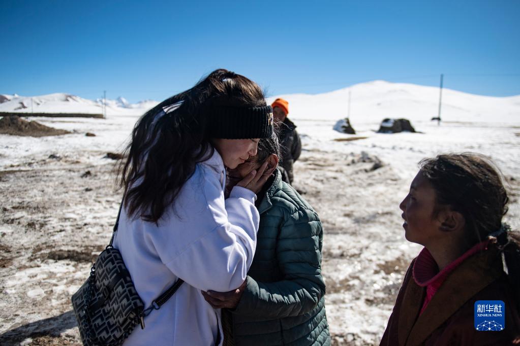 旦增卓玛(左)以藏北牧民特有的方式和奶奶贴面行礼(1月18日摄)。新华社记者 孙瑞博 摄