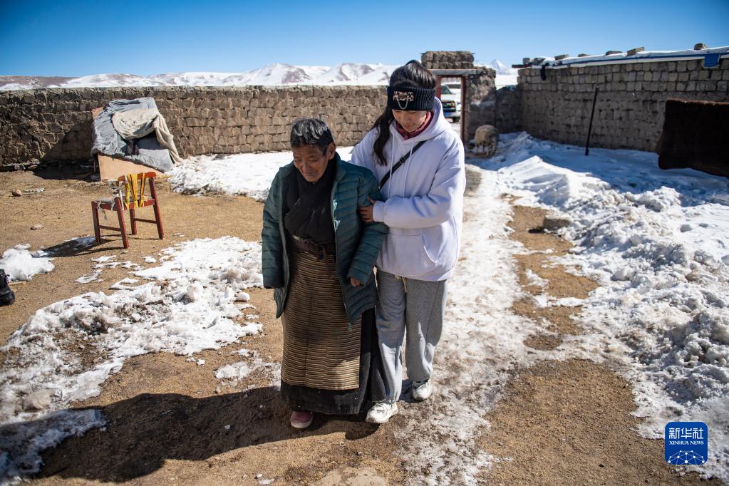 旦增卓玛(右)扶着奶奶进屋(1月18日摄)。新华社记者 孙瑞博 摄