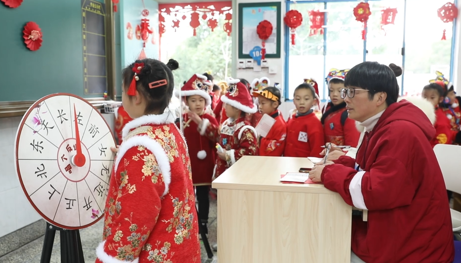 身穿红棉袄,头戴“虎头帽”,手拿各色游园积分卡在满是窗花、灯笼、中国结的教室里穿梭,居敬小学一二年级的学生还未放寒假,就已体验到了浓浓的年味。