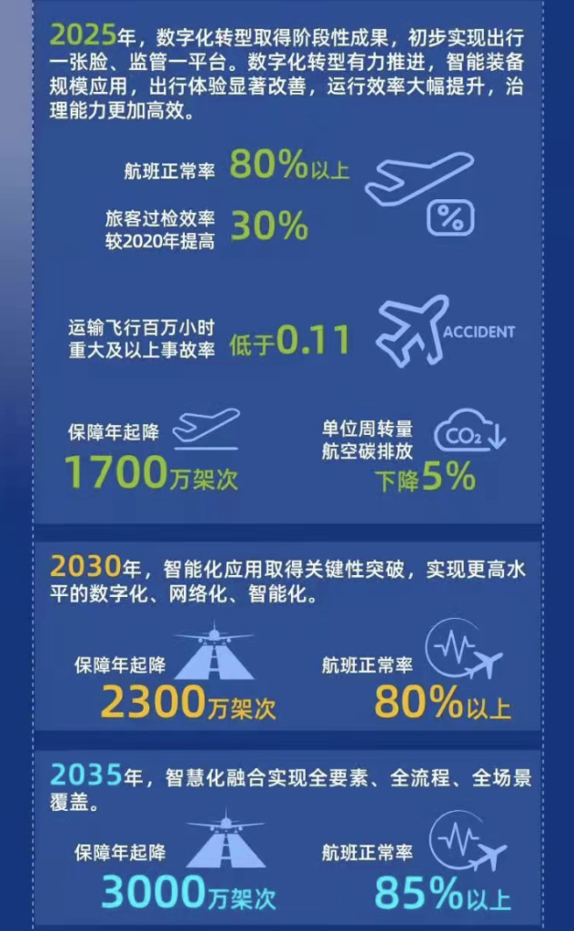 到2035年,全面实现“出行一张脸、物流一张单、通关一次检、运行一张网、监管一平台”目标,航班正常率达到85%以上,国内国际航班支持“无纸化”和生物识别通关,主要国际航班实现托运行李全流程跟踪等。