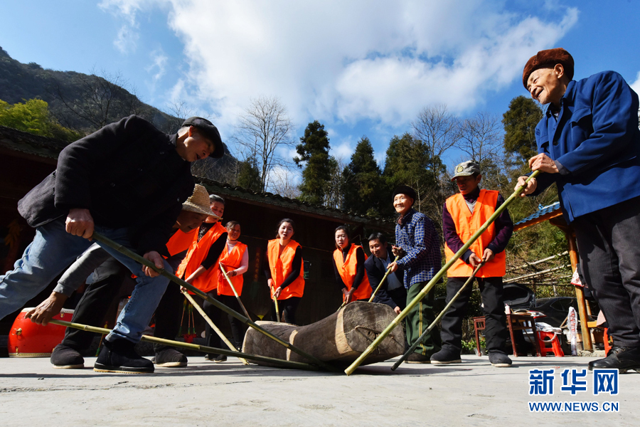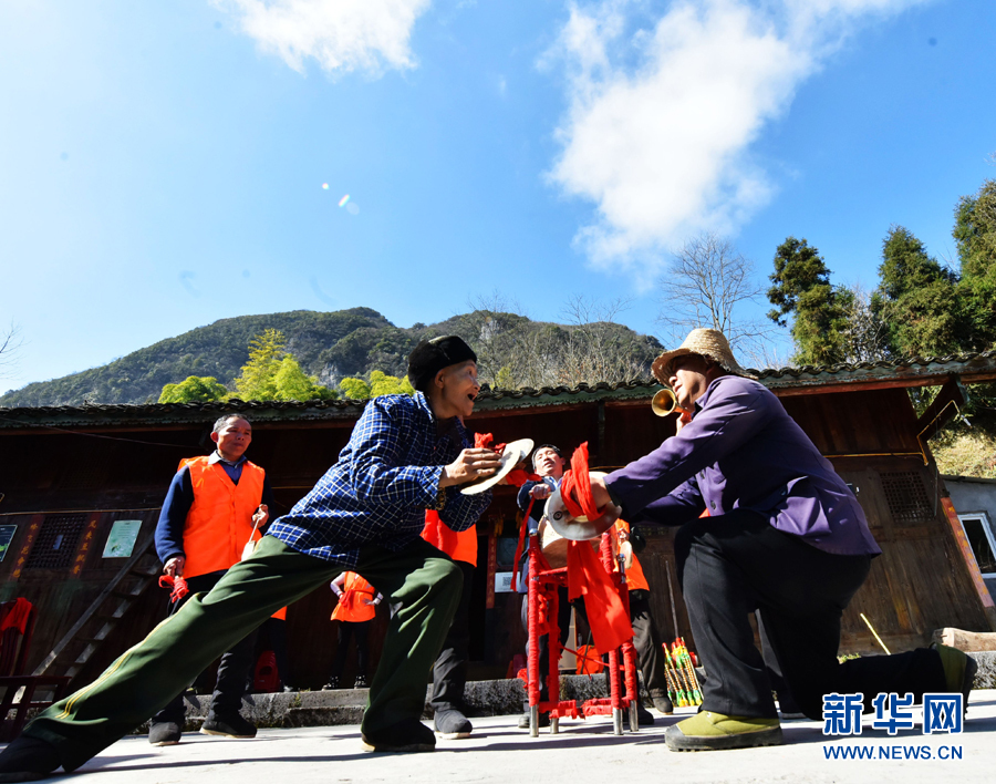 图为当地村民表演土家拗岩号子。新华网发(陈碧生 摄)
